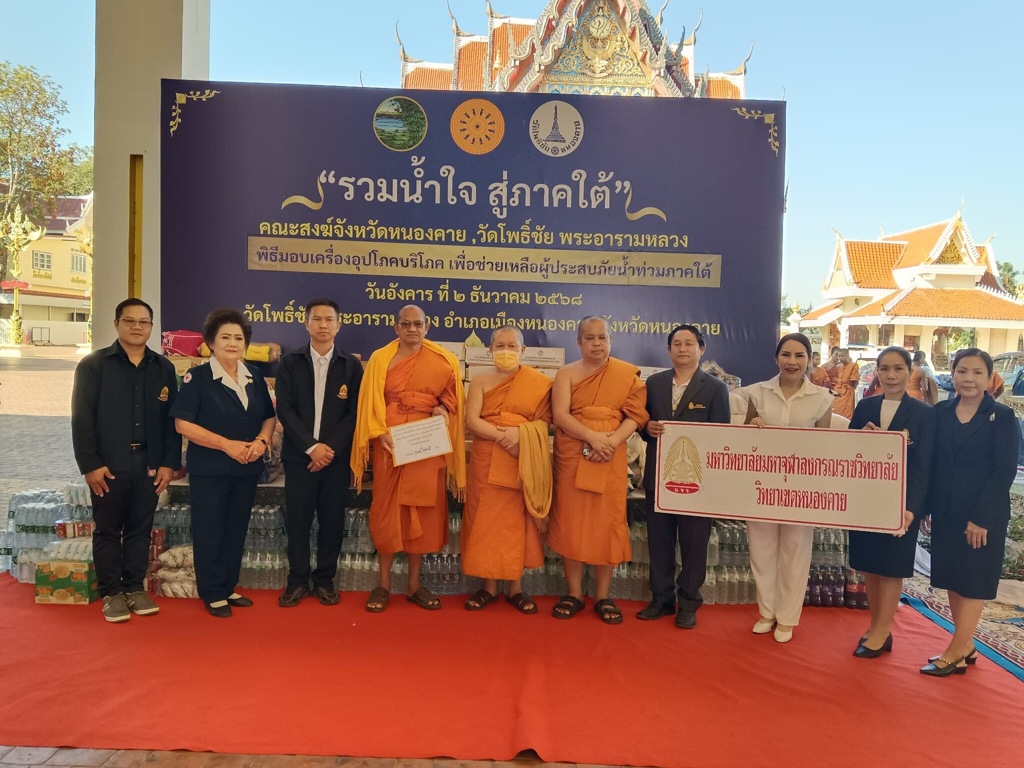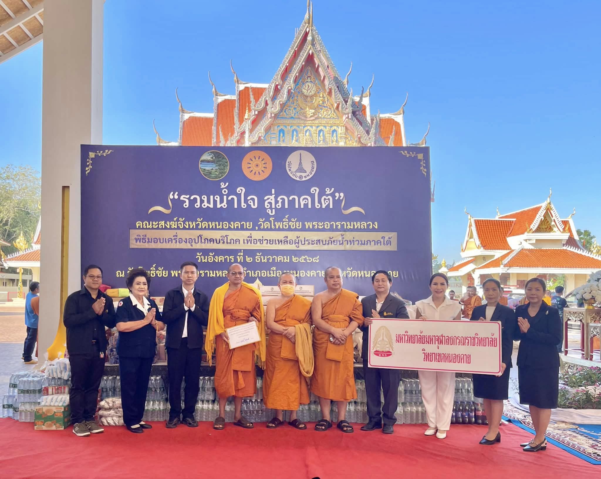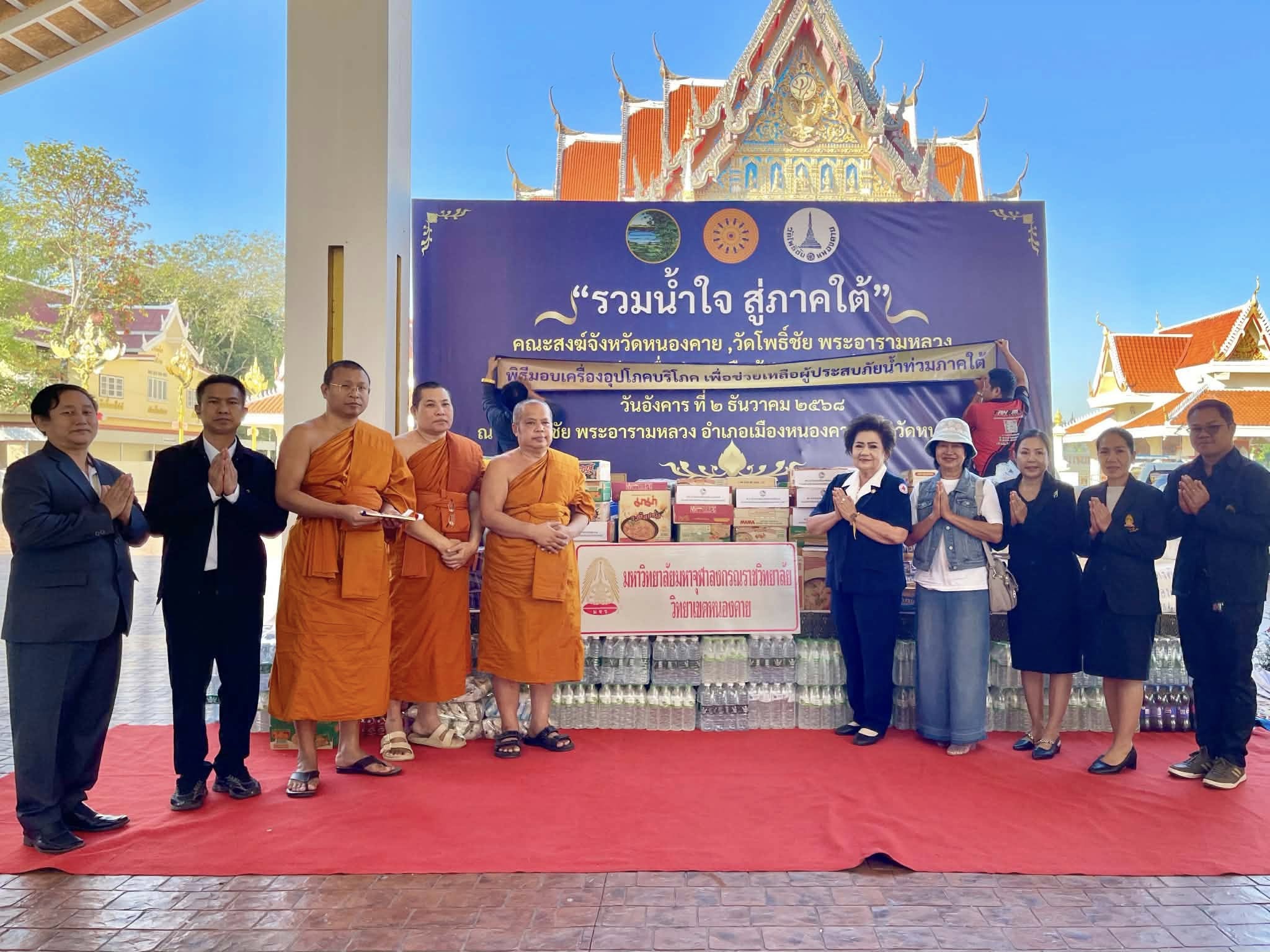 มจร วิทยาเขตหนองคาย ร่วมกับคณะสงฆ์จังหวัดหนองคาย วัดโพธิ์ชัย พระอารามหลวง และส่วนราชการ พ่อค้า ประชาชน ทุกภาคส่วน ผู้มีจิตศรัทธา หน่วยงานภาครัฐ เอกชน และประชาชนทั่วไป จัดพิธีมอบเครื่องอุปโภคบริโภค เพื่อช่วยเหลือผู้ประสบภัยน้ำท่วมภาคใต้ เพื่อสนับสนุนการช่วยเหลือ และบรรเทาความเดือดร้อนให้แก่พี่น้องประชาชนผู้ประสบภัยน้ำท่วมในพื้นที่จังหวัดภาคใต้