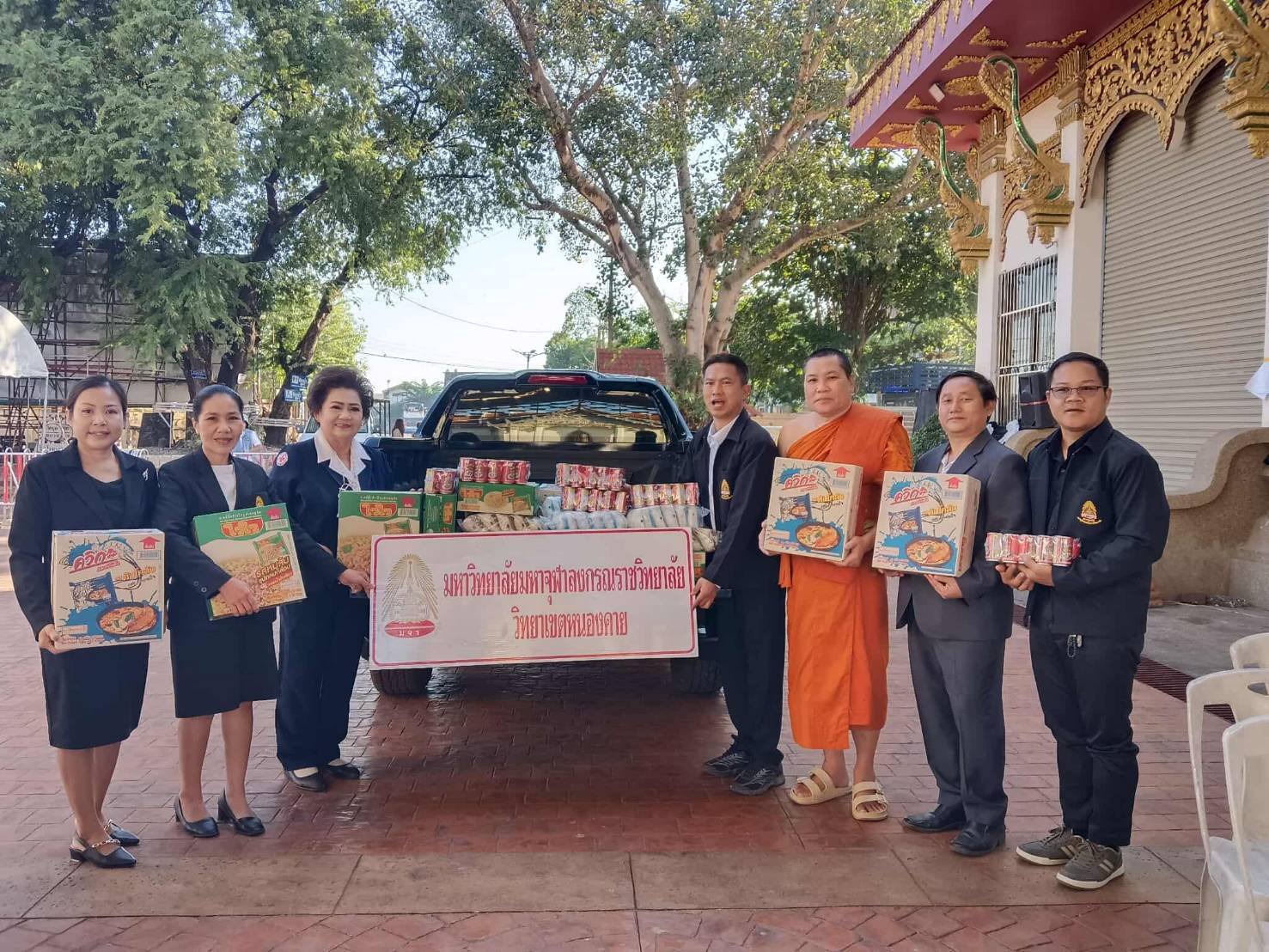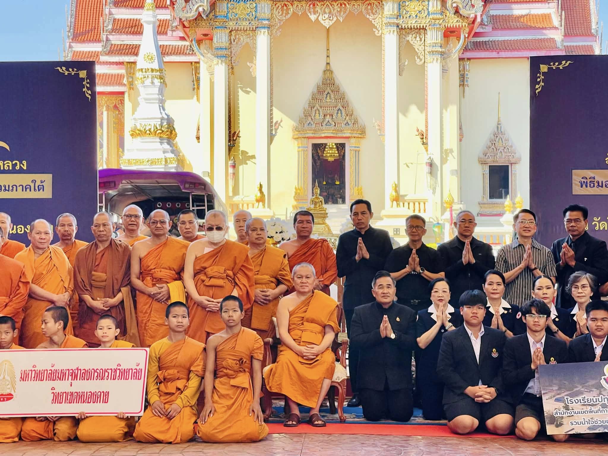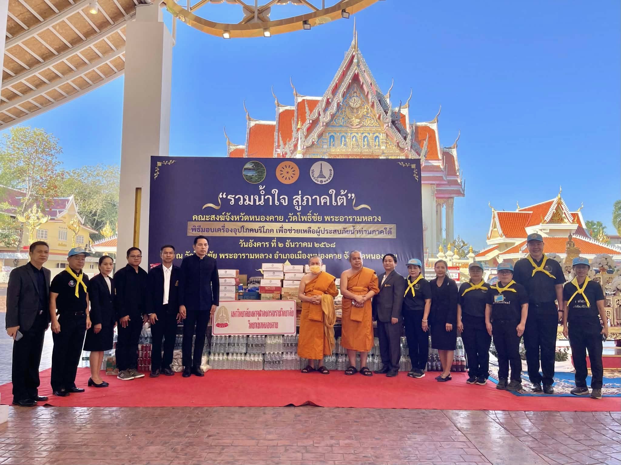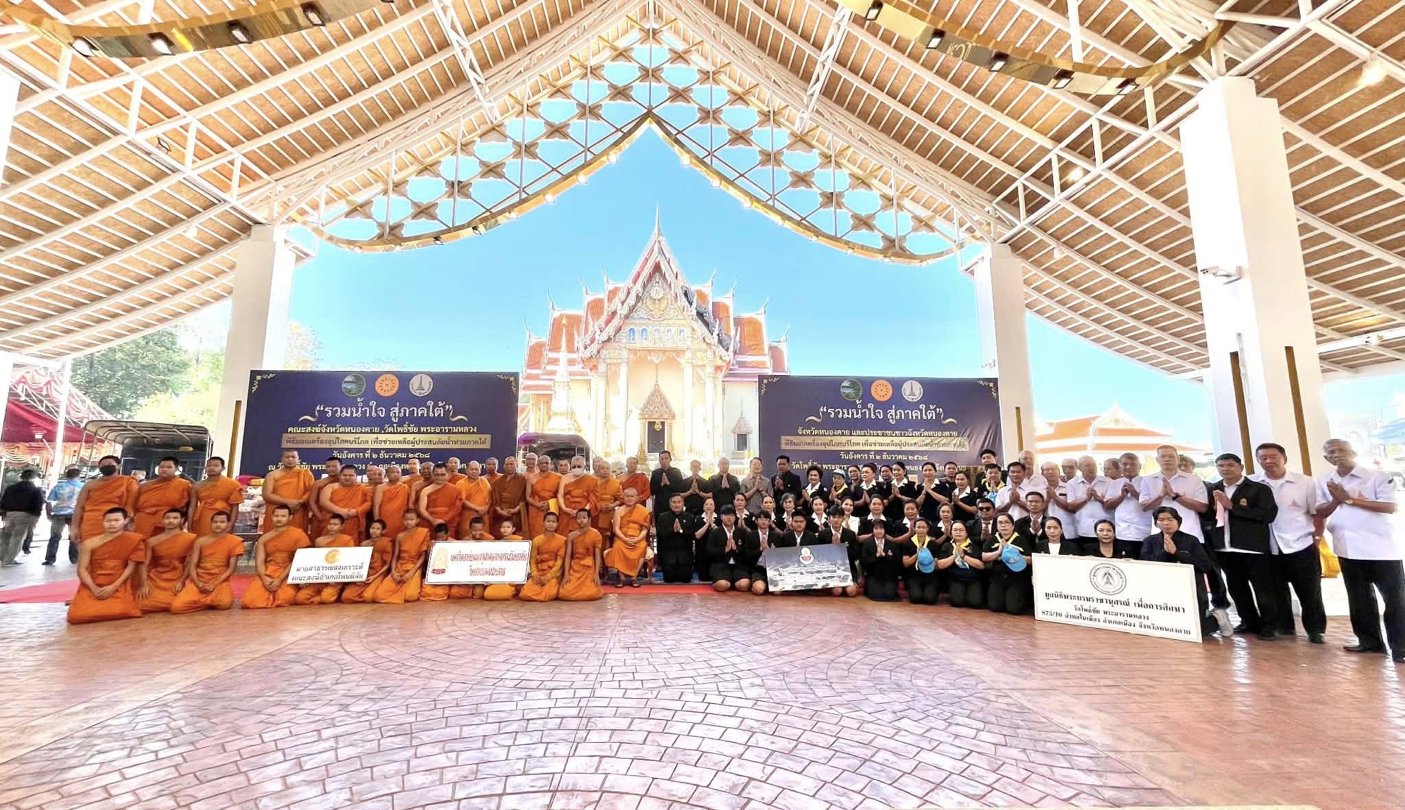 มจร วิทยาเขตหนองคาย ร่วมกับคณะสงฆ์จังหวัดหนองคาย วัดโพธิ์ชัย พระอารามหลวง และส่วนราชการ พ่อค้า ประชาชน ทุกภาคส่วน ผู้มีจิตศรัทธา หน่วยงานภาครัฐ เอกชน และประชาชนทั่วไป จัดพิธีมอบเครื่องอุปโภคบริโภค เพื่อช่วยเหลือผู้ประสบภัยน้ำท่วมภาคใต้ เพื่อสนับสนุนการช่วยเหลือ และบรรเทาความเดือดร้อนให้แก่พี่น้องประชาชนผู้ประสบภัยน้ำท่วมในพื้นที่จังหวัดภาคใต้