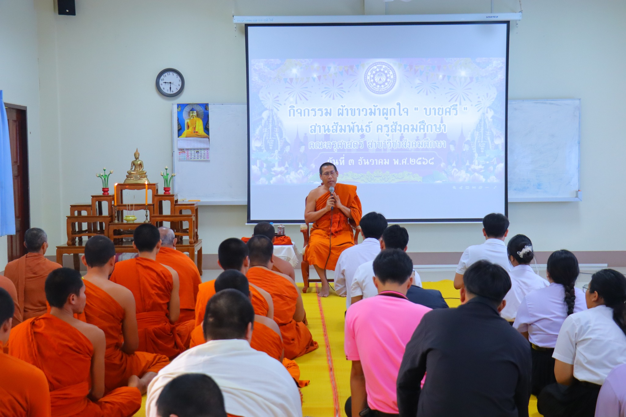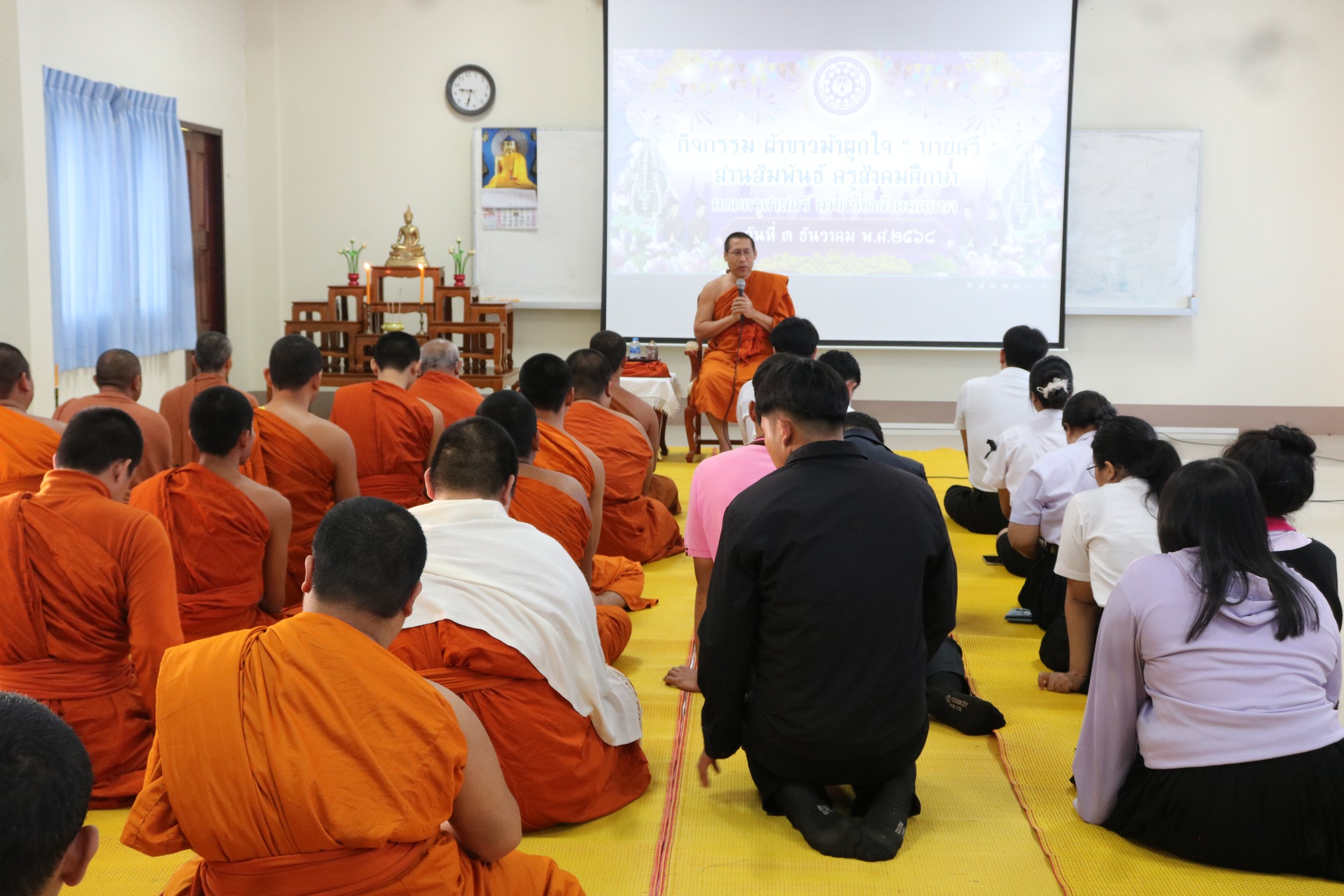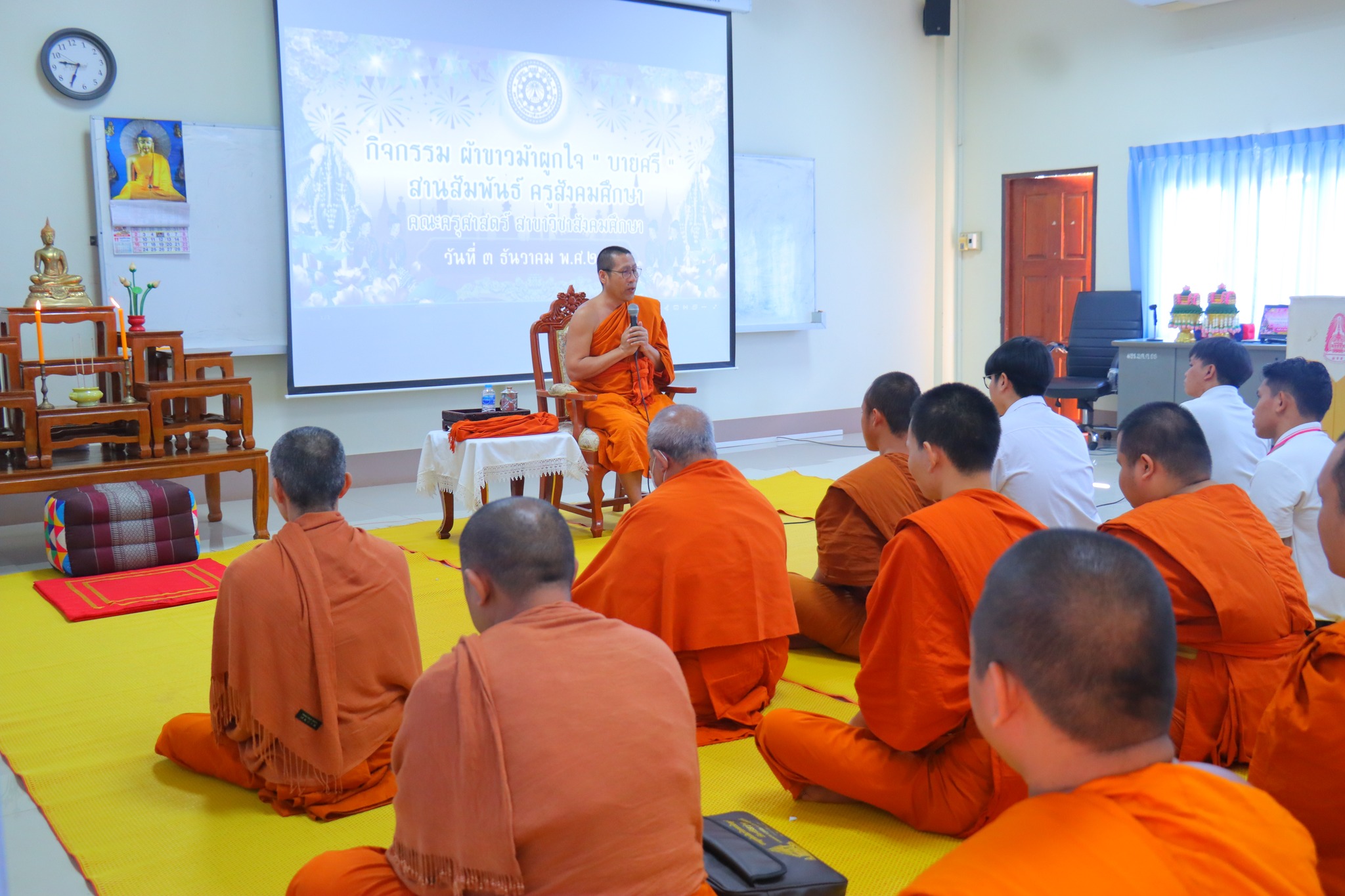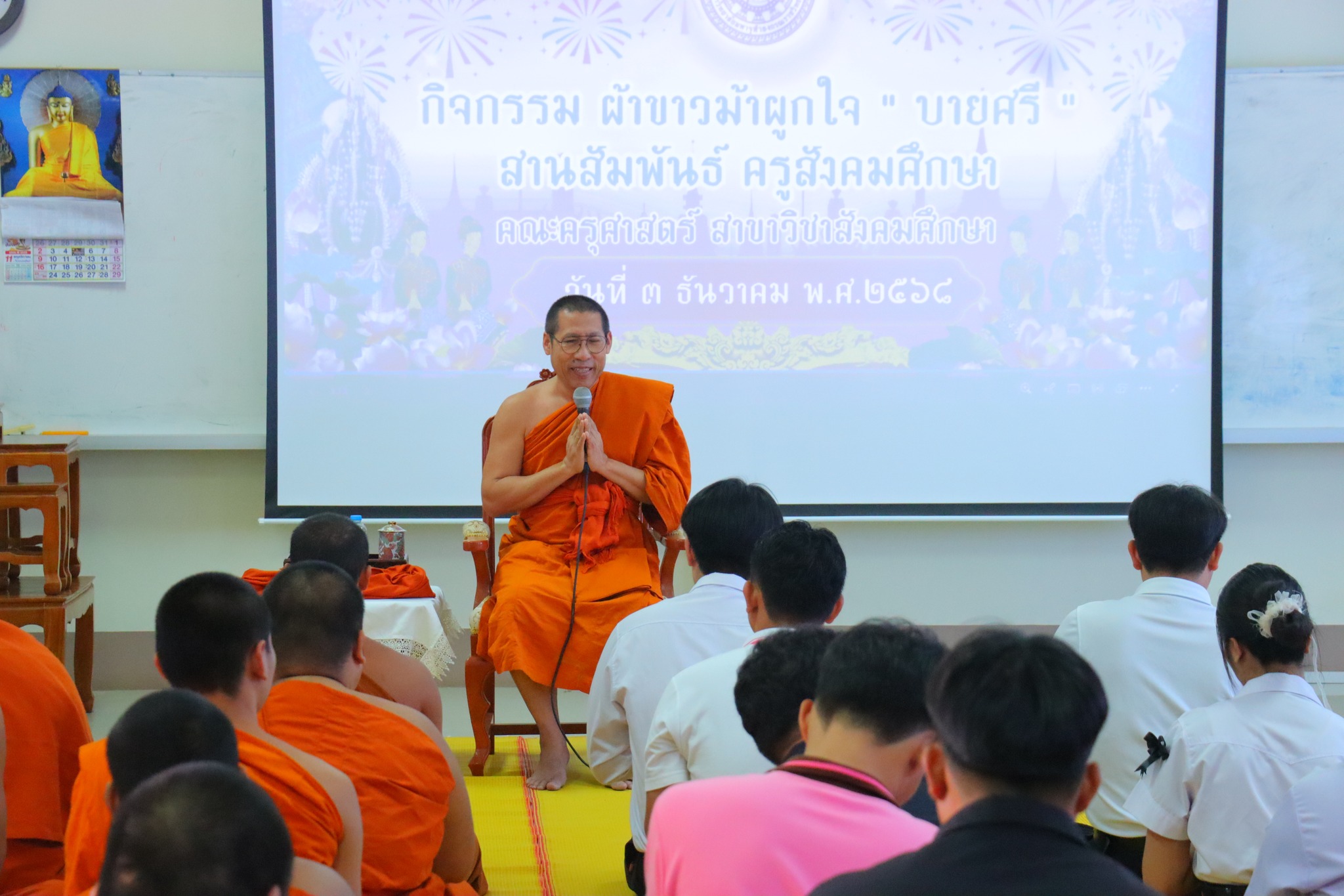 #คณะครุศาสตร์ จัดกิจกรรม “ผ้าขาวม้าผูกใจ บายศรี สานสัมพันธ์ ครูสังคมศึกษา” (ชุดที่ ๓) วันพุธ ที่่ ๓ ธันวาคม ๒๕๖๘ เวลา ๐๙.๐๐ น. __.#พระมหาสมเด็จ มหาสมิทฺธิ,ผศ.ดร. ผู้อำนวยการวิทยาลัยสงฆ์หนองคาย เป็นประธานกล่าวเปิดกิจกรรม “ผ้าขาวม้าผูกใจ บายศรี สานสัมพันธ์ ครูสังคมศึกษา” และกล่าวให้โอวาทแก่นิสิตคณะครุศาสตร์ที่เข้าร่วมกิจกรรม โดยมีวัตถุประสงค์ เพื่อความสามัคคีภายในสาขา เพื่อความรัก และเคารพซึ่งกันและกัน ณ อาคาร ๕ พระสุนทรธรรมธาดา (บุญเลิศ เขมปญฺโญ) มหาวิทยาลัยมหาจุฬาลงกรณราชวิทยาลัย วิทยาเขตหนองคาย