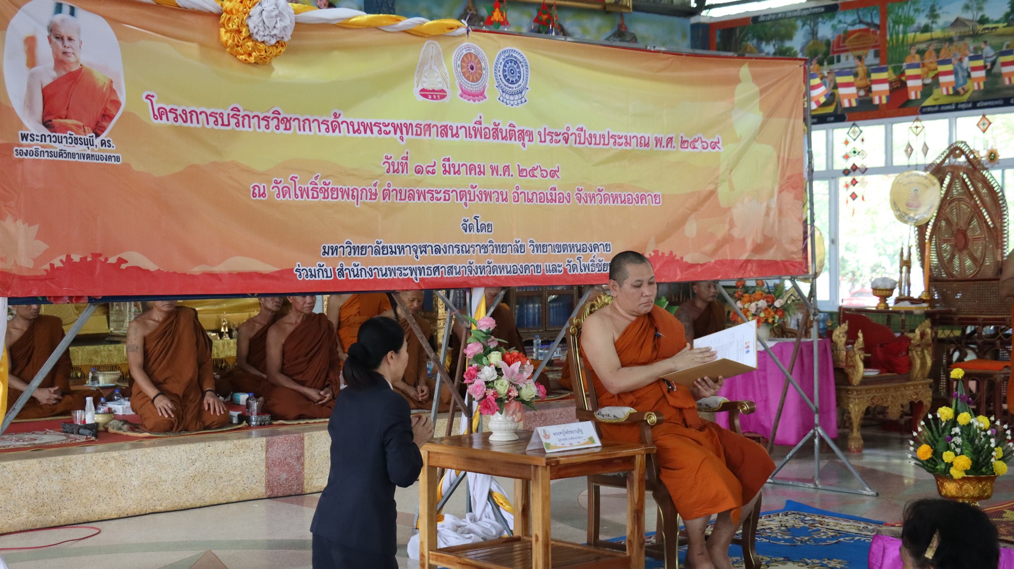 พระภาวนาวัชรมุนี,ดร. รองอธิการบดีวิทยาเขตหนองคาย มอบหมายให้ พระครูโพธิชยานุสิฐ ผู้ช่วยอธิการบดีฝ่ายบริหาร เป็นประธานกล่าวเปิดโครงการบริการวิชาการด้านพระพุทธศาสนาเพื่อสันติสุข ประจำปีงบประมาณ ๒๕๖๙